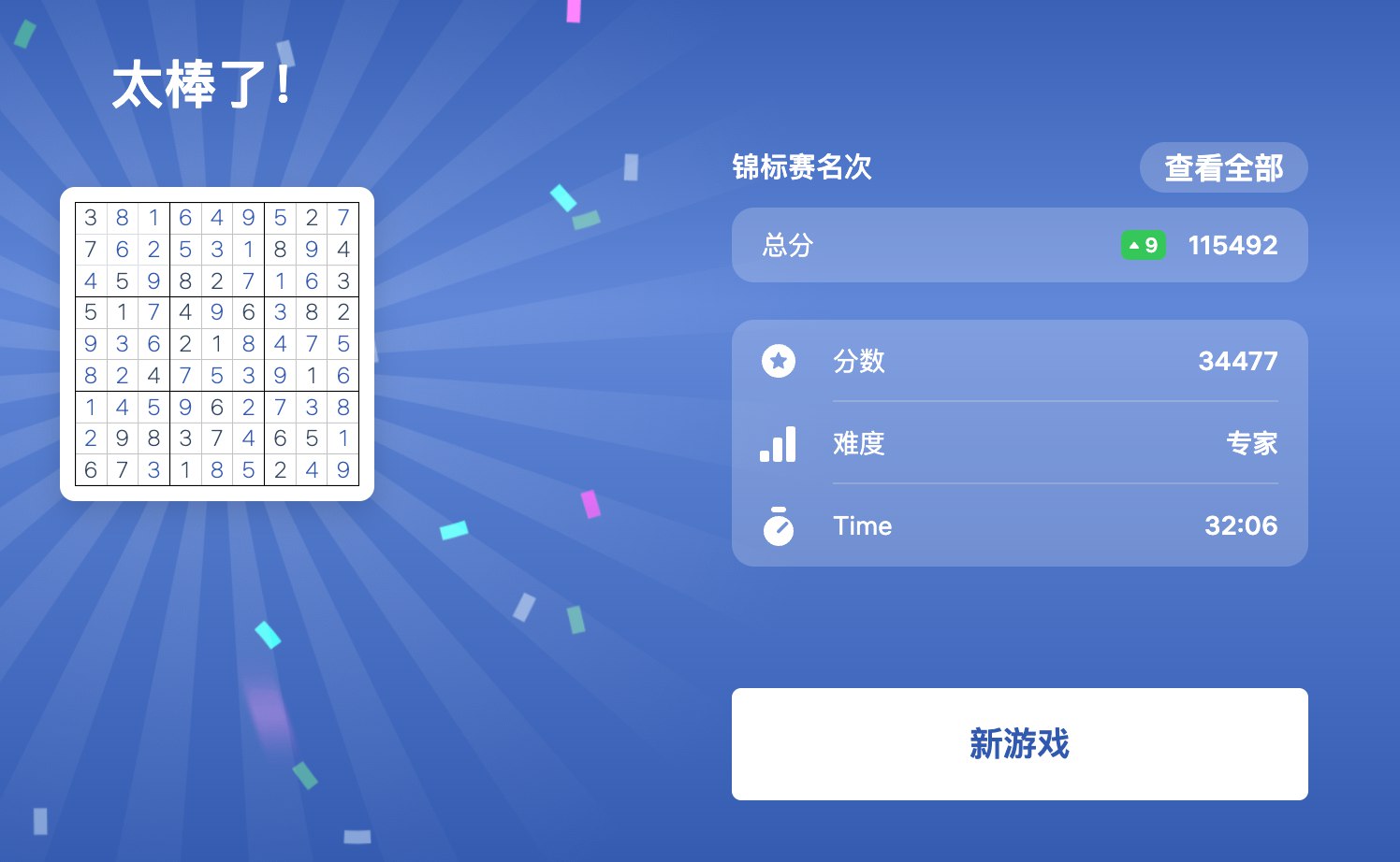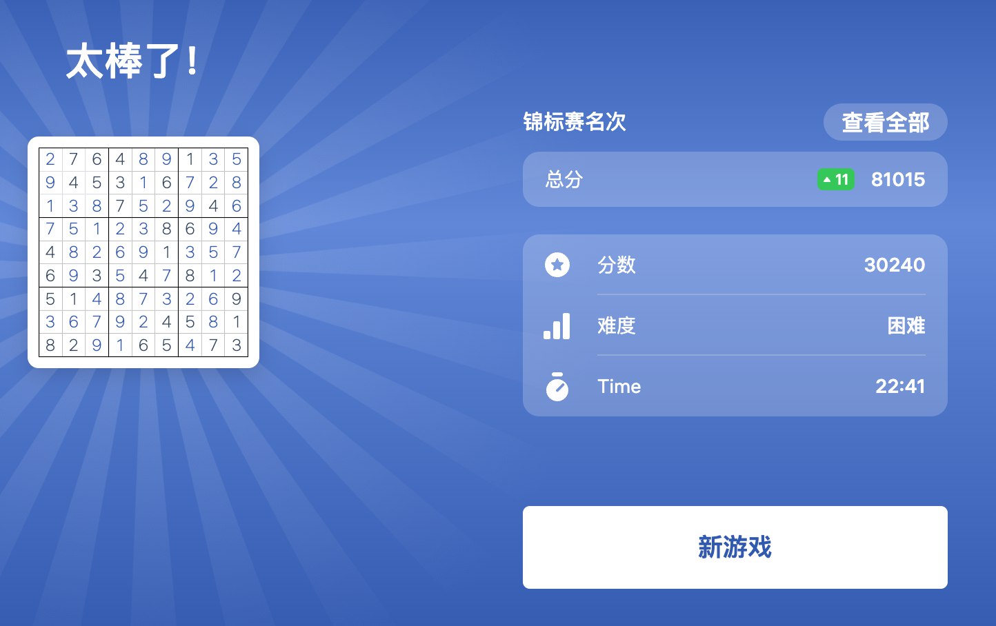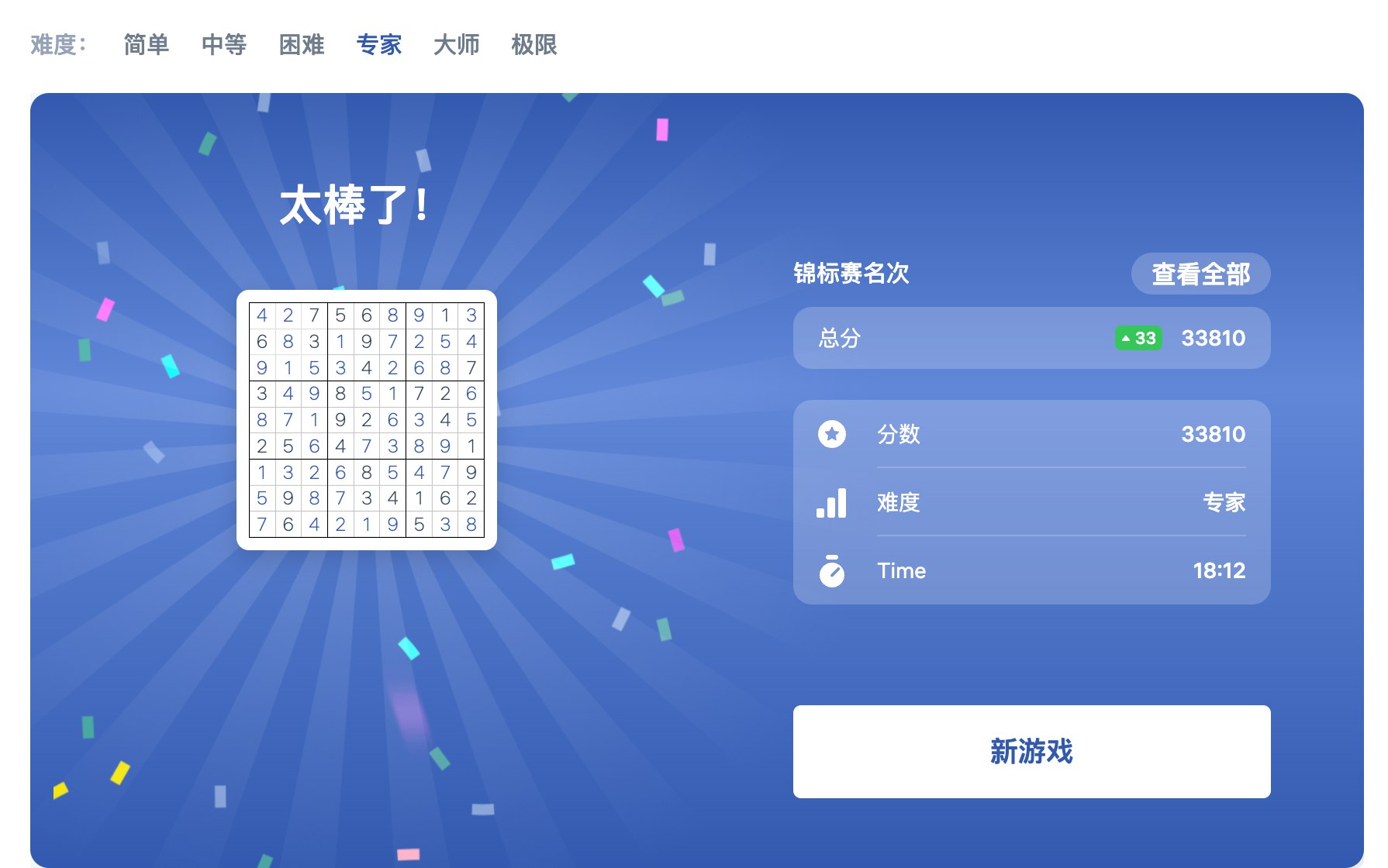 此处隐藏10次简单数独的训练 虽然操作变得异常流程,速度也不断加快,但平均成绩还是4分半左右,最好的一次如图,估计是这个更简单